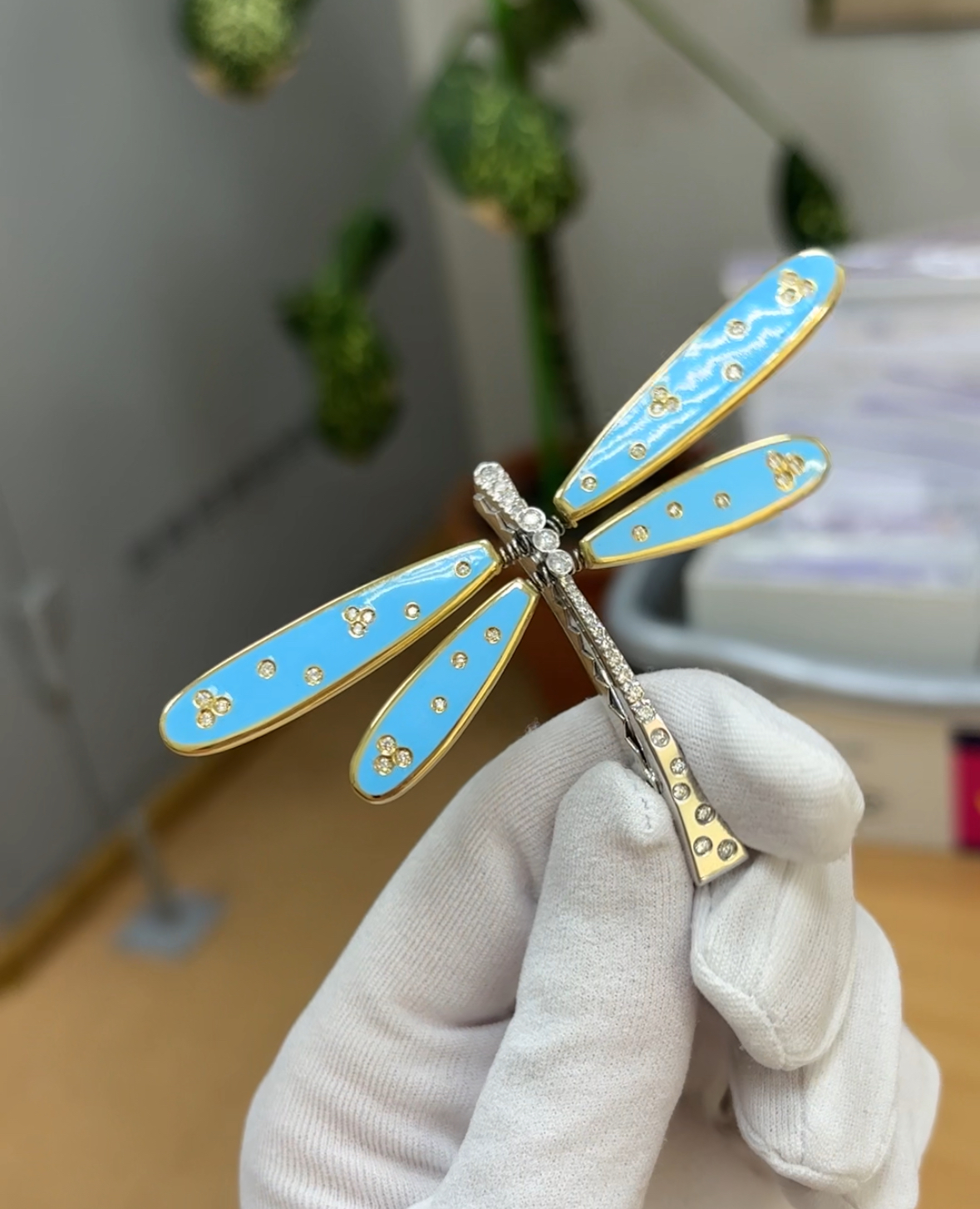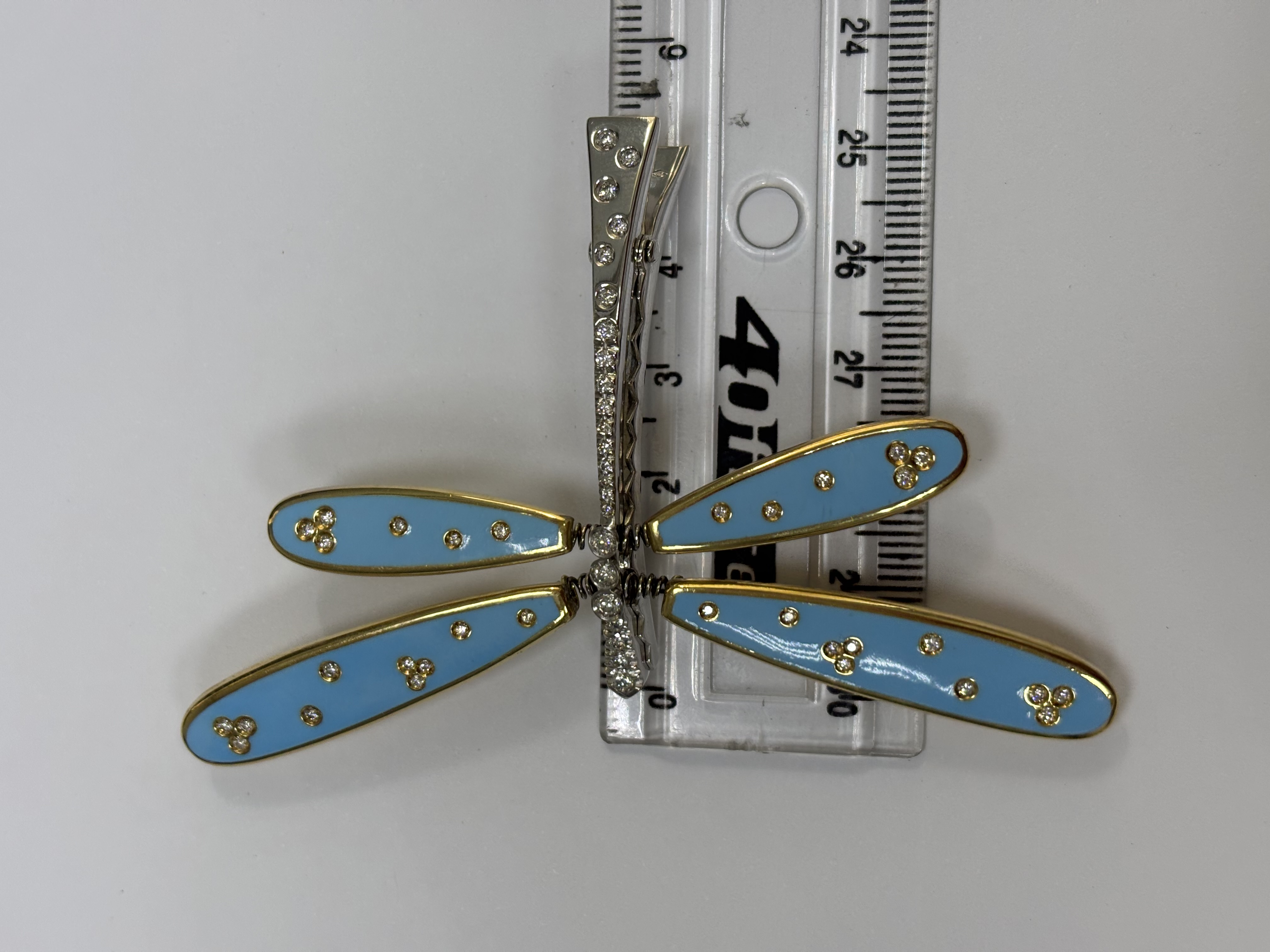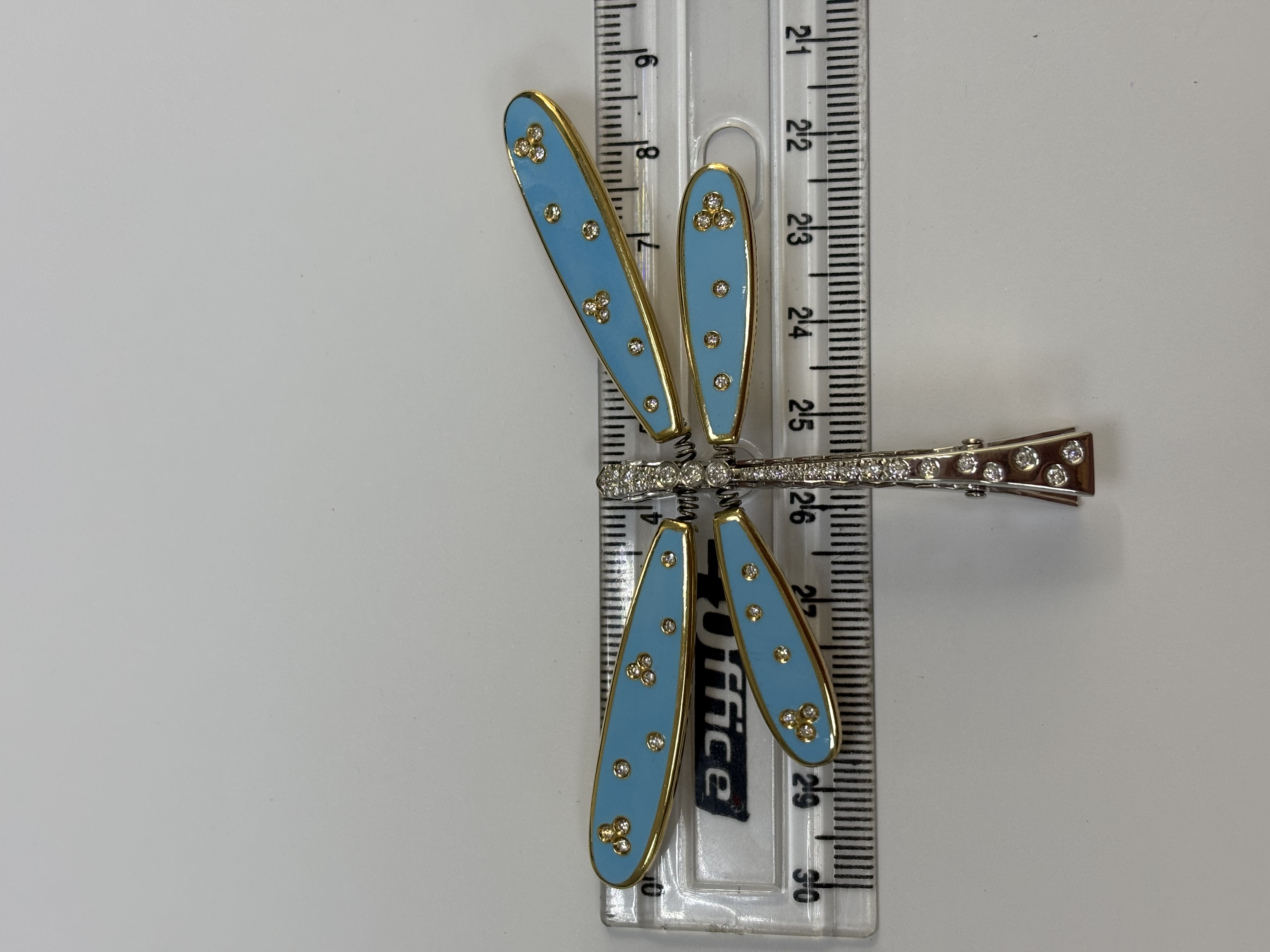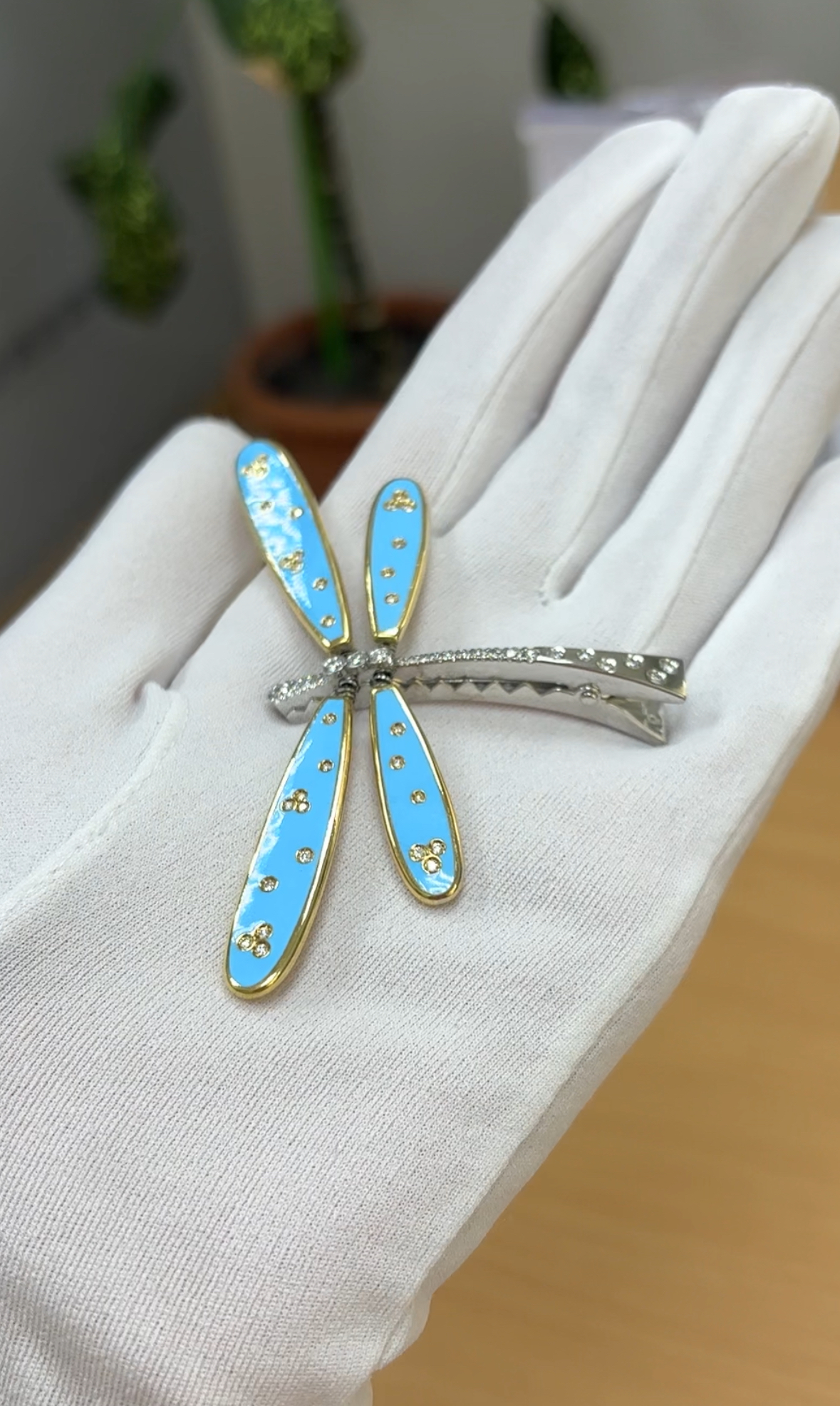 Золотая брошь в желтом с белым цвете с белыми бриллиантами и эмалью «Стрекоза» 01-200599779