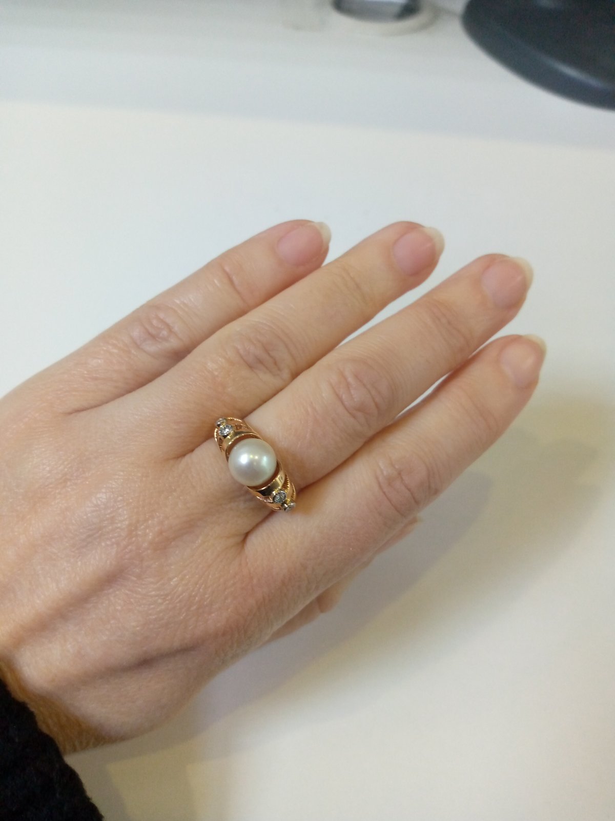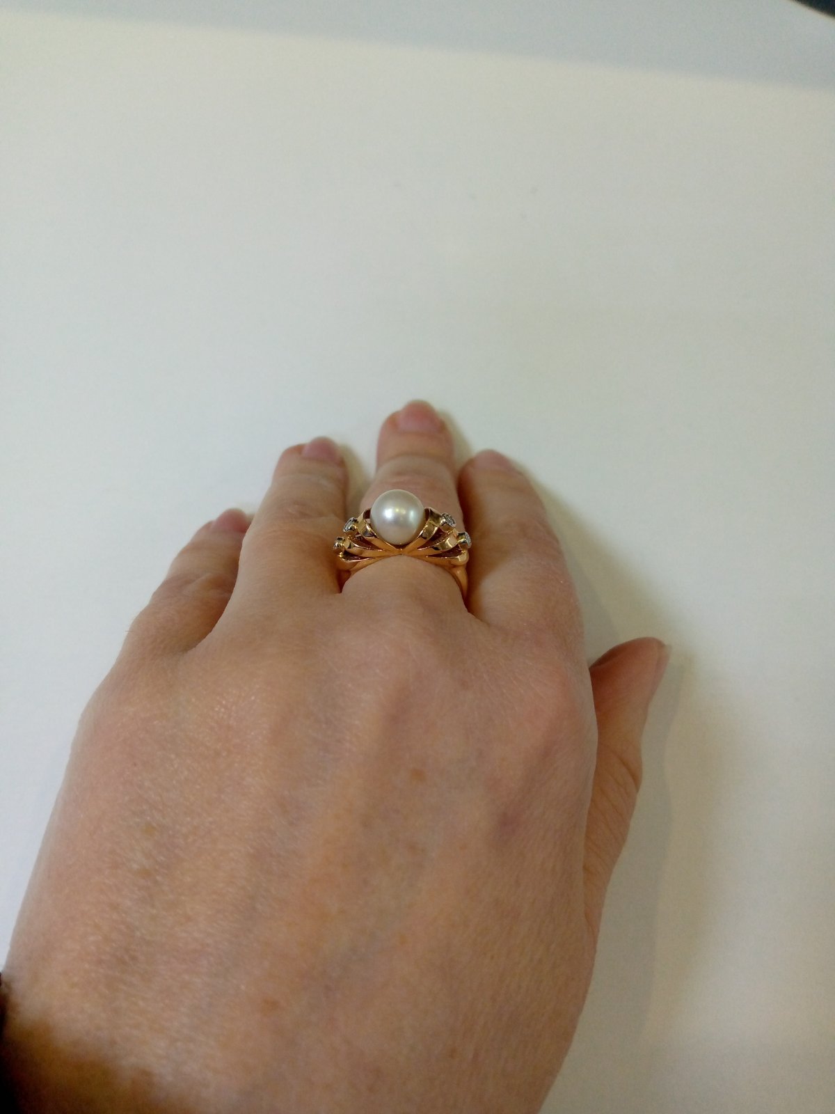 Золотое кольцо красного с белым цвета с белыми бриллиантами и жемчугом 01-200213688