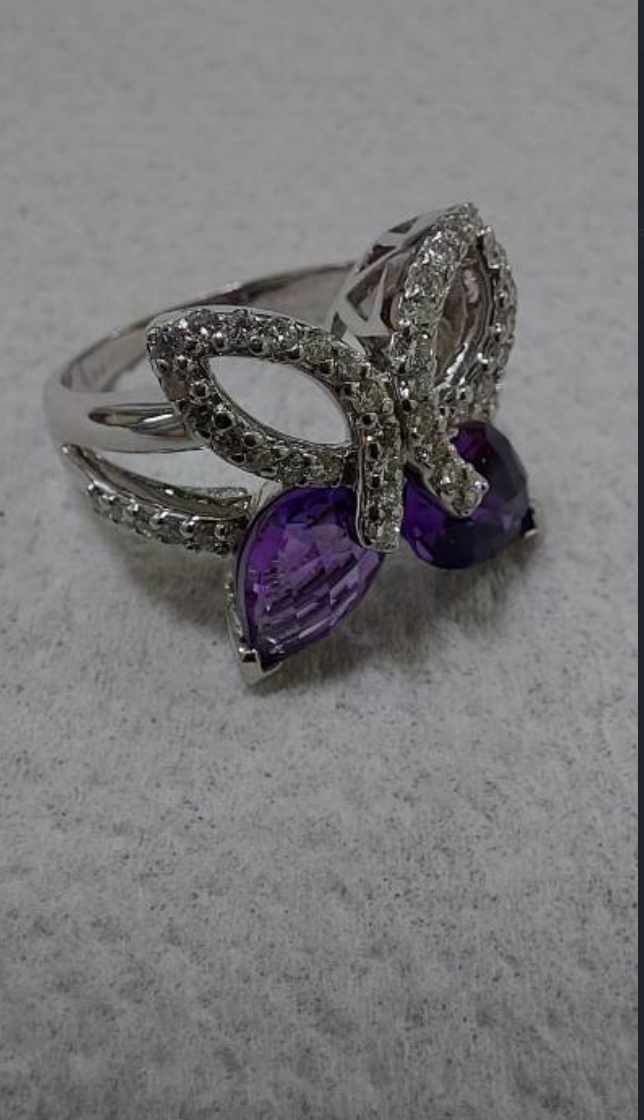 Золотое кольцо в белом цвете с фиолетовыми аметистами и белыми бриллиантами 01-200169461
