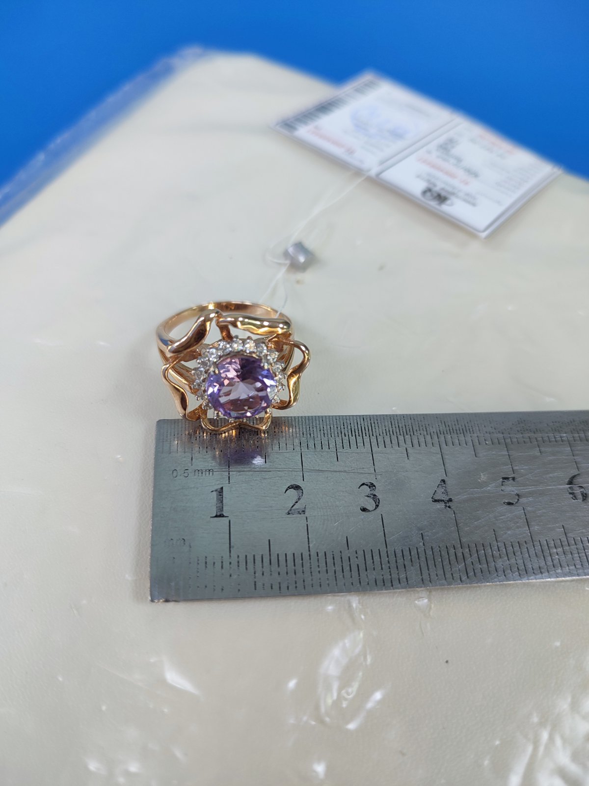 Золотое кольцо в красном с белым цвете с сиреневым аметистом и цирконом «Цветок» 01-200405221