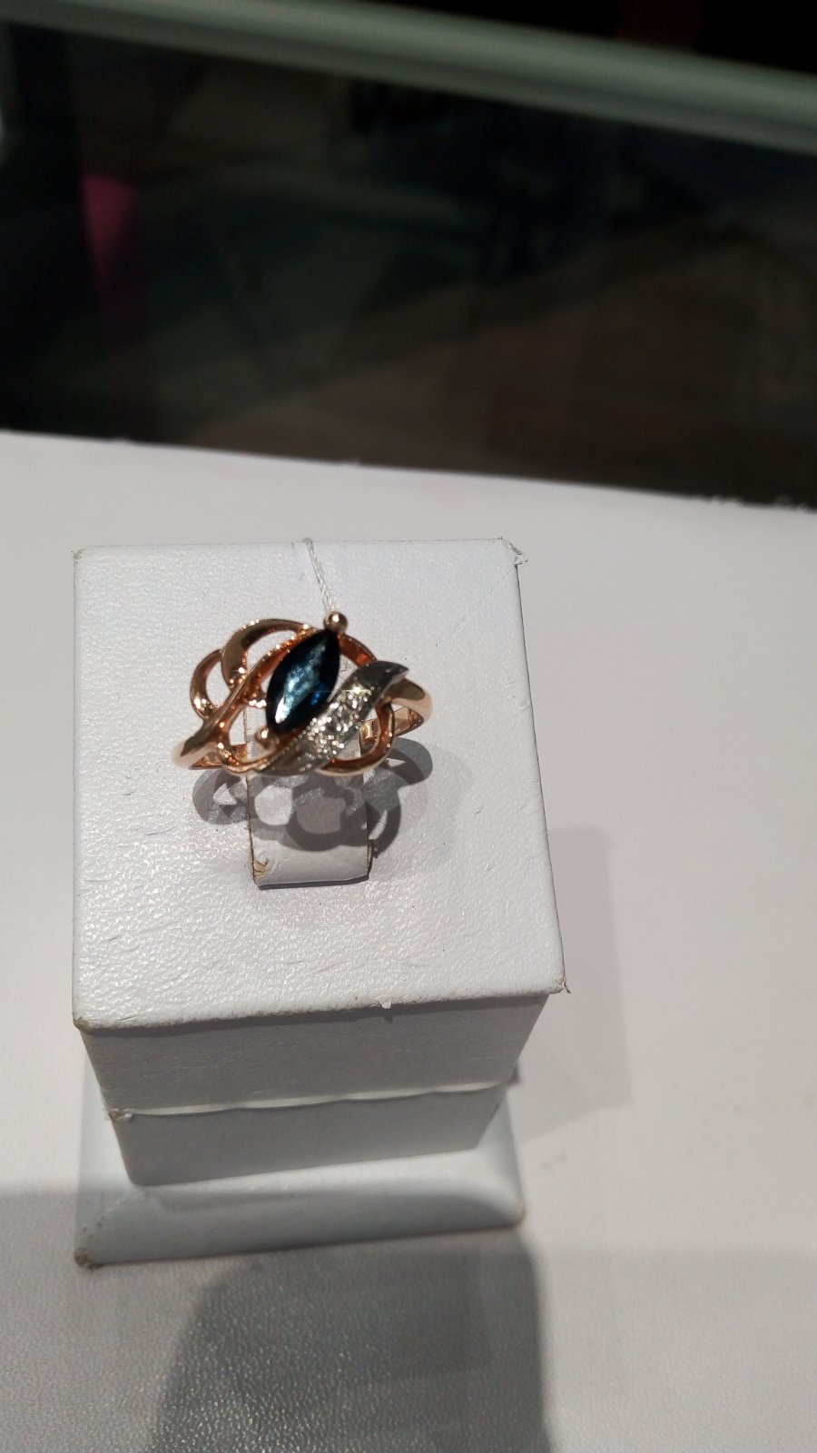 Золотое кольцо в красном с белым цвете с синим корундом и белыми бриллиантами 01-200079588