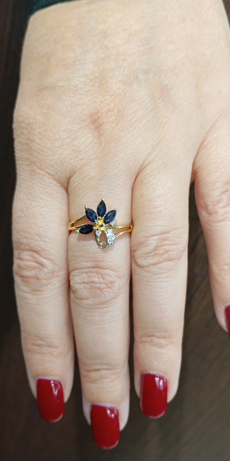 Золотое кольцо желтого цвета с синими корундами и белыми бриллиантами 01-200313473