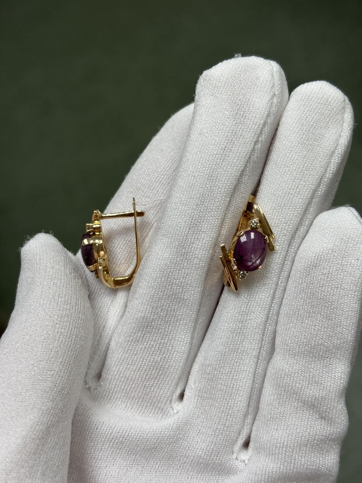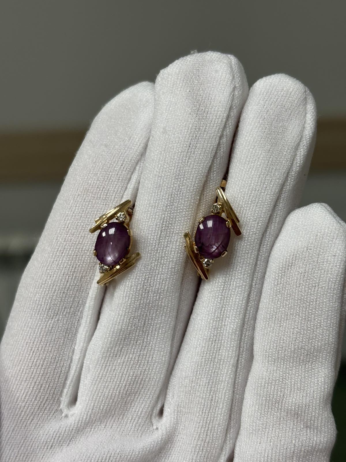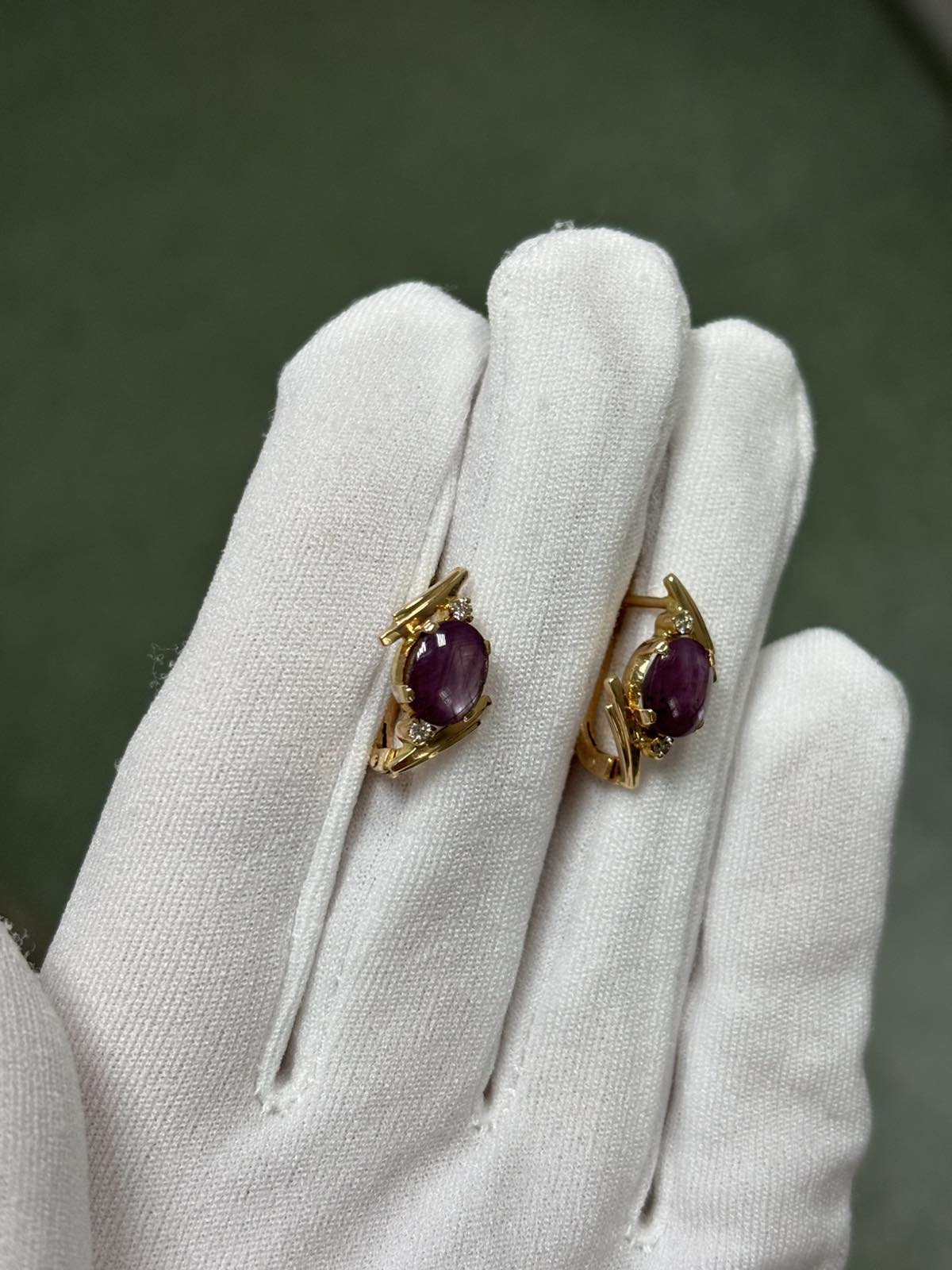 Золотые серьги в красном цвете с сиреневыми корундами и желтыми бриллиантами 01-200188781